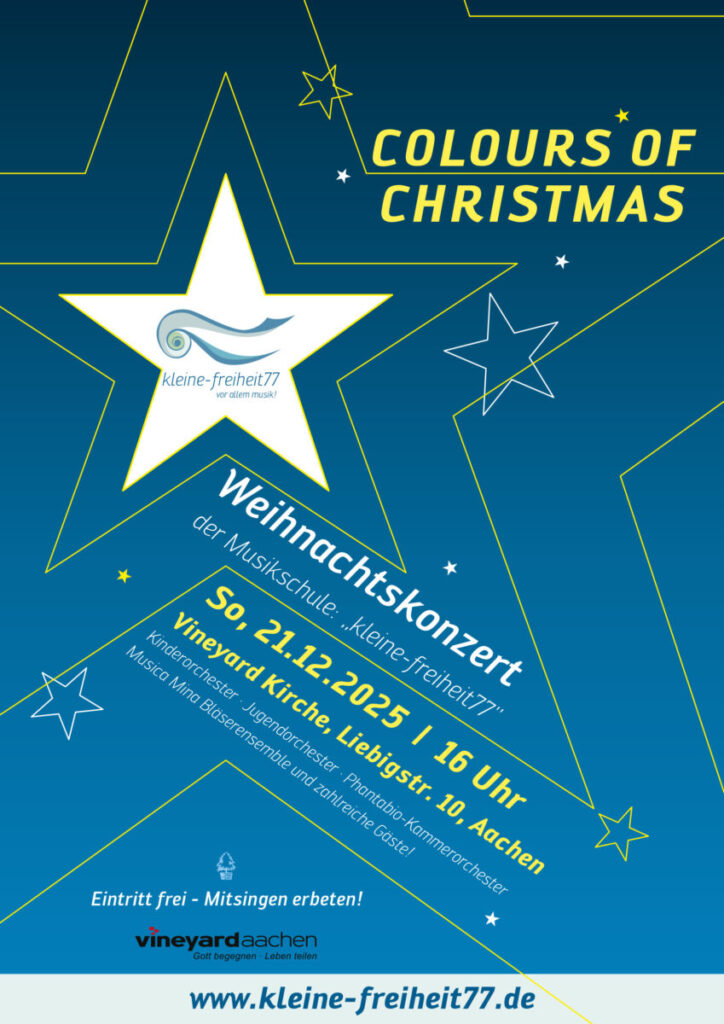 Weihnachtskonzert 2025Wir laden Euch alle ganz herzlich zu unserem Weihnachtskonzert: COLOURS OF CHRISTMAS ein.Sonntag, 21.12.2025 / 16 hVineyard Kirche, Liebigstraße 10, AachenEs spielen alle Orchester der kleinen-freiheit 77 (in erweiterter Besetzung) sowie das Musica Mina Bläserquintett. Wir freuen uns auf Euren Besuch!